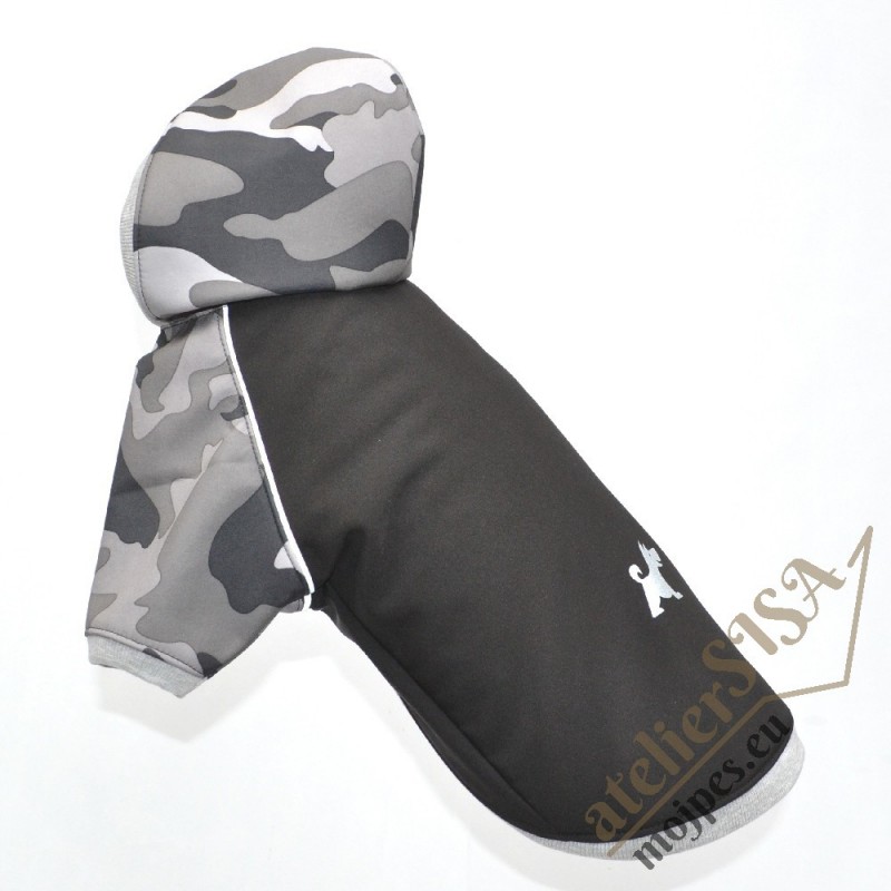 Čierno sivá maskáčová nepremokavá bunda je ušitá zo zimného softshellu. Lemy sú z pružného sivého bavlneného nápletu. Má reflexné pásy vo švoch, ktoré odrážajú svetlo, čo zabezpečuje lepšiu viditeľvosť v zme. Bunda poskytuje psovi pohodlie a komfort vďaka prispôsobivému materiálu a ochráni ho pred dažďom a zimou. Zapína sa na brušku plastovými patentkami. Bundičky sú šité pre menšie plemená.