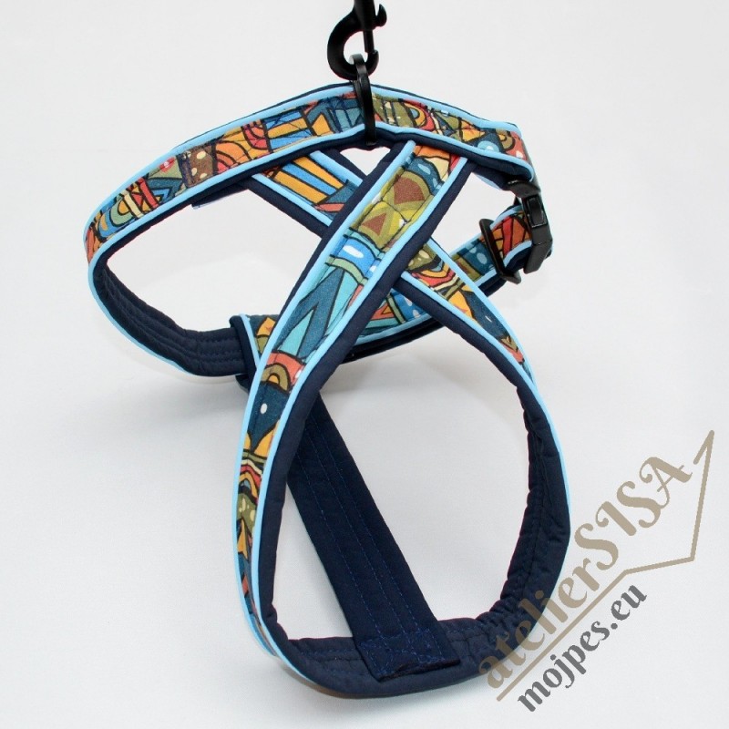 Reflexný vychádzkový postroj je ušitý zo sofshellu, ktorý je vodeodolný a pevný, ale zároveň mäkký, aby sa v ňom váš pes cítil príjemne. Základný materiál je softshell v červenej alebo tmavomodrej farbe. Zdobený je indiánskym vzorovaným pásom z bavlny, ktorý je lemovaný bledomodrými alebo červenými reflexnými okrajmi, pre lepšiu viditeľnosť psa v tme. Má nastaviteľnú veľkosť okolo hrudníka, čierne plastové zapínanie a zváraný polokrúžok na uchytenie vodítka.
